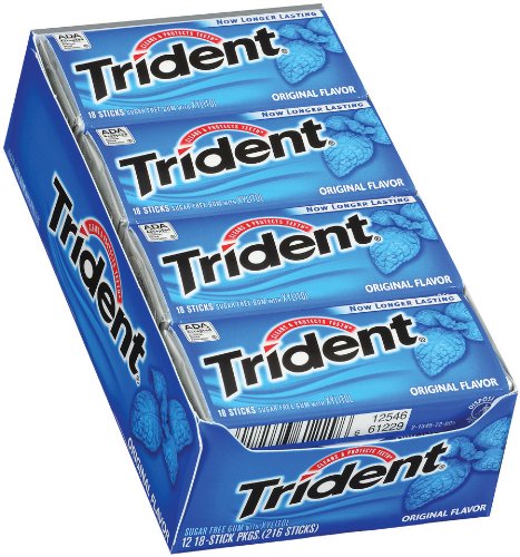 5 of 5 people found the following review helpful Amazon Verified Purchase I don't usually chew gum, but I found out it has xylitol in it, which is good for your teeth, because it kills the hamful bacteria. I bought it for when I go on vacation for those times I cannot brush my teeth. I expected it to taste minty, but even though it has a fresh taste, it has a flavor I cannot describe, I really like it, but only occasionally, so it will last a long time. I was really busy recently, painting the outside of the house. I didn't have time for breaks, so I put three of the small pieces in my mouth and enjoyed chewing them most of the day, the fresh taste lasted a long time. 2 of 2 people found the following review helpful By Techthusiast "n00b" (Earth) - See all my reviews Amazon Verified Purchase This review is from: Trident Gum, Original Flavor, 18-Stick Packs (Pack of 12) (Grocery) What can I say. It's gum... I haven't done extensive tests but I enjoyed the three pieces I've chewed and I feel good about having ordered a 12-pack.Planted them around my abode and in my satchels and car. I am now ready for any situation that requires gum. Thanks Trident! Thanks Amazon! 2 of 2 people found the following review helpful By Amazon Verified Purchase This review is from: Trident Gum, Original Flavor, 18-Stick Packs (Pack of 12) (Grocery) Trident gum is good for your teeth...sugarless with xylitol (natural sugar alcohol) which kills germs and actually helps teeth remineralize. This is my favorite flavor (original) with a more "crisp" minty taste. The flavor lasts too! 5 stars!One star lacking because the cost for this bulk package is only slightly less than buying individually. Overall, a very good purchase delivered right to my door. |